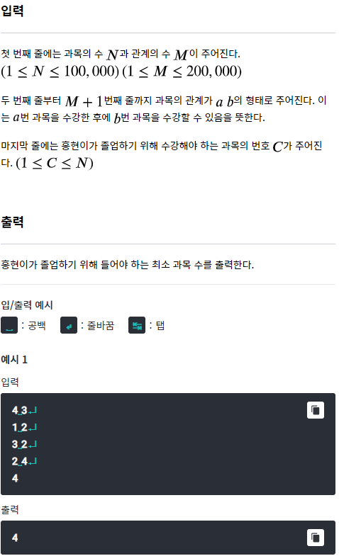//N 과목의 수, M 관계의 수 , 졸업하기 위해 들어야하는 과목 C