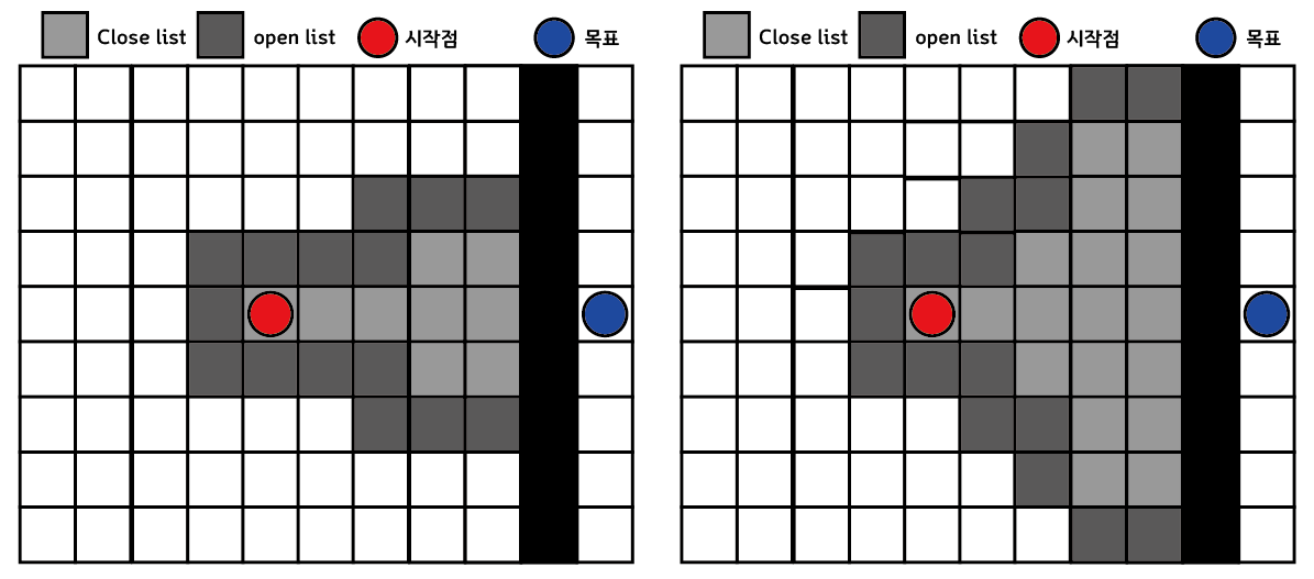 아직 조사하지 않은 상태들을 담은 '열린 목록'(Open List), 이미 조사한 상태들은 담은 '닫힌 목록'(Closed List)