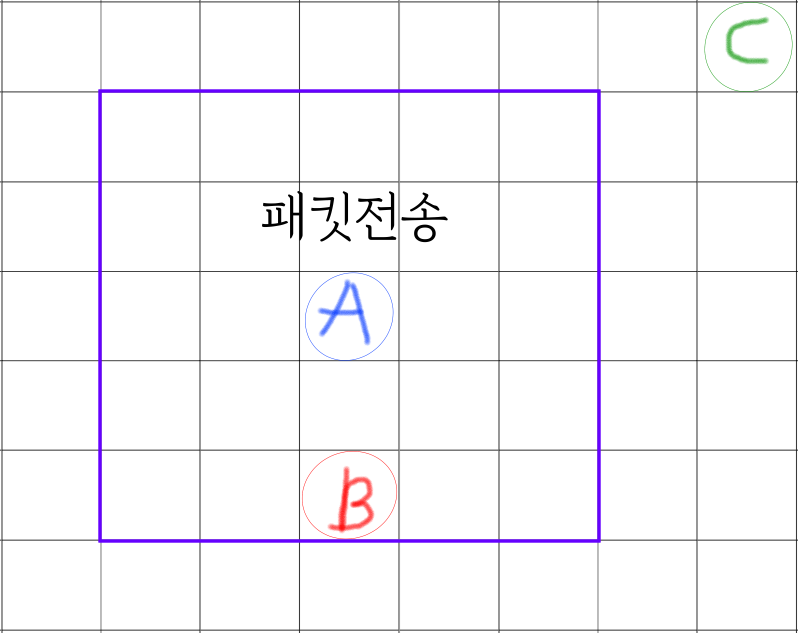 그리고 NearList에 있는 객체들 중에서 파란색 원(A)의 시야(보편적으로 클라이언트 화면에 보이는 시야)에 들어오는 B와는 서로 패킷을 주고받으며 시야 밖에 있는 C에 대해서는 서로 패킷 전송을 하지 않는다.