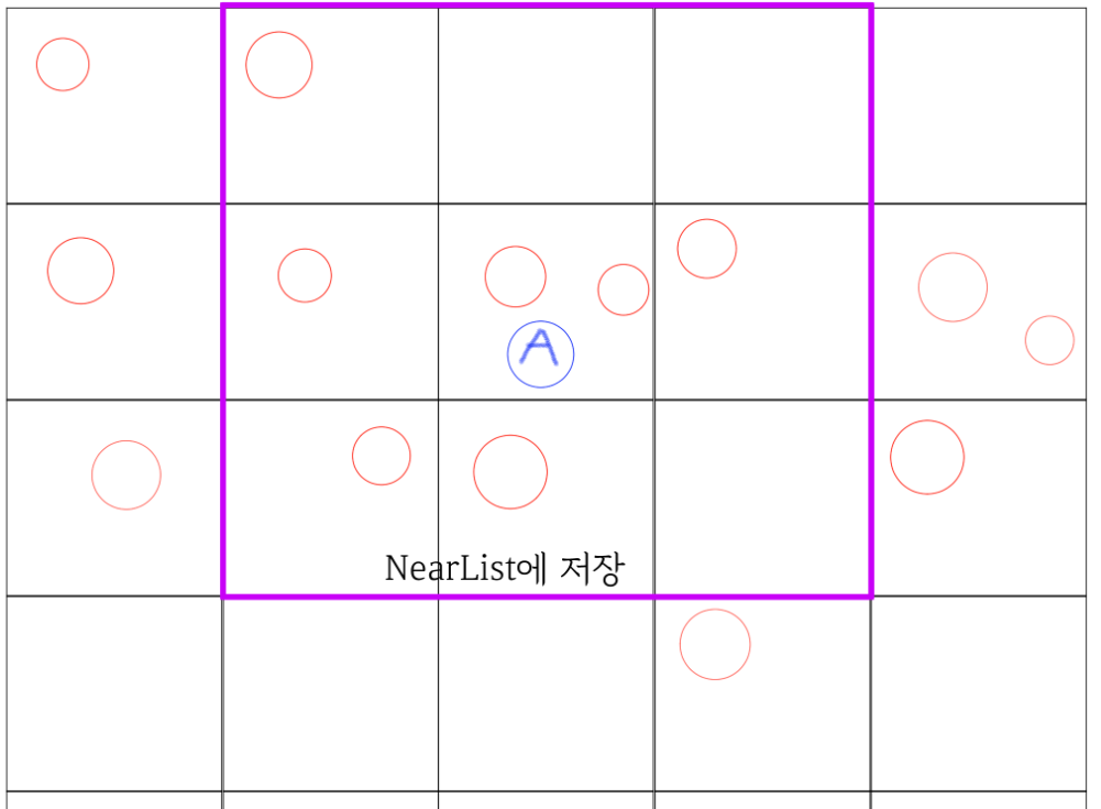 먼저 Sector로 맵을 나눠서 파란색 원(A) 기준으로 주변에 있는 객체들을 NearList에 집어넣는다.