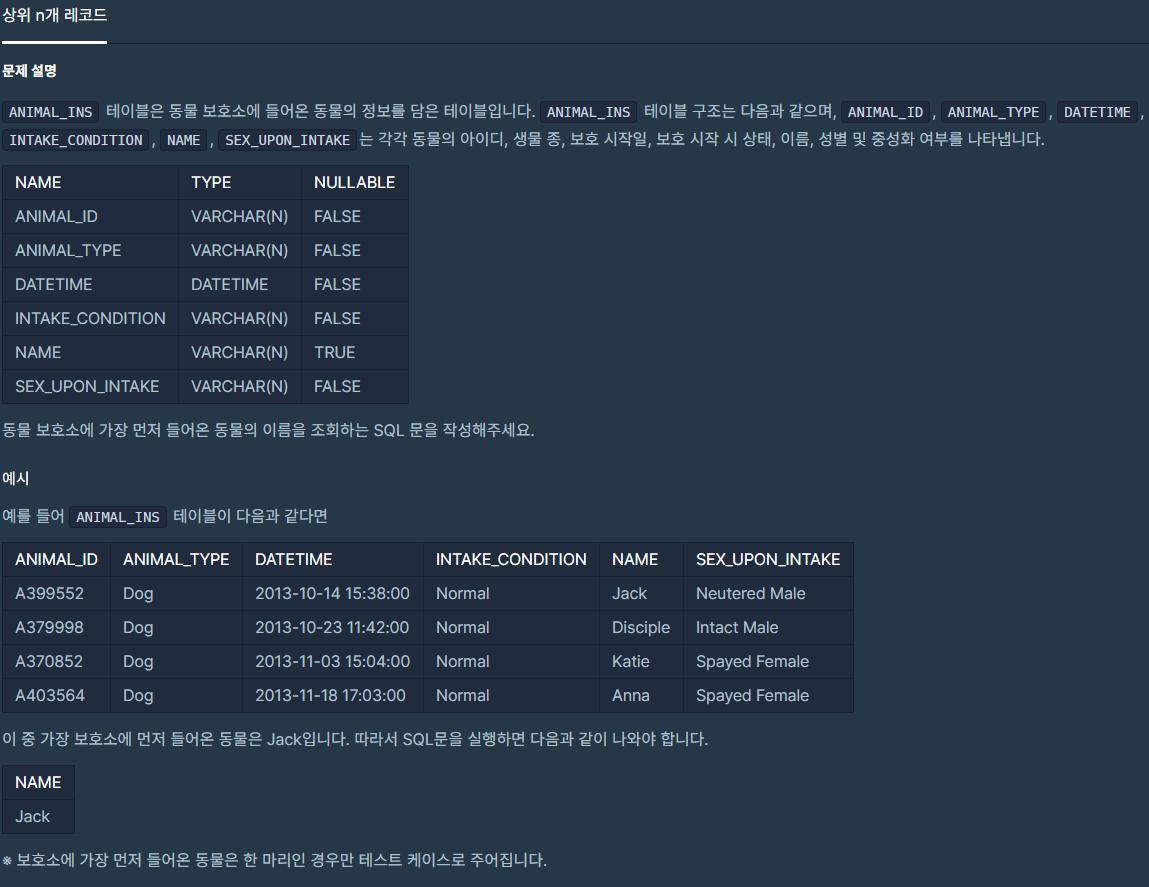 상위 n개 레코드: 코딩테스트 연습 - 상위 n개 레코드 | 프로그래머스 (programmers.co.kr)