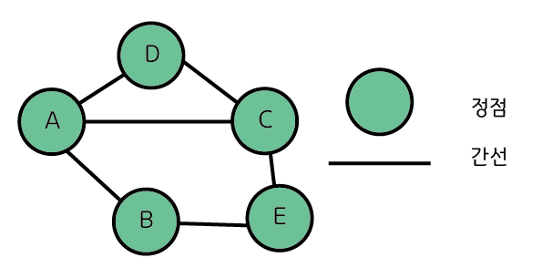 A, B, C, D, E와 같은 노드들을 정점(Vertex) 간선(Edage)는 이들 사이의 연결을 의미하며 위의 그림은 알파벳의 관계를 정점과 간선을 이용해서 표현했기 때문에 그래프라 할 수 있다. 이렇게 방향성이 없는 그래프를 무방향 그래프(Undirected Graph)라고 한다.