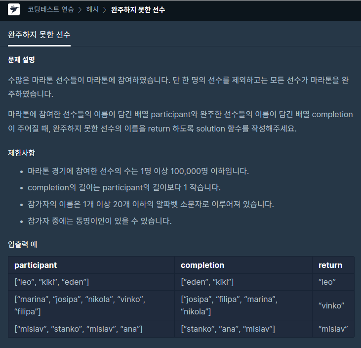 문제 링크:https://programmers.co.kr/learn/courses/30/lessons/42576