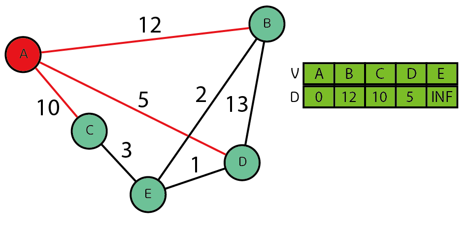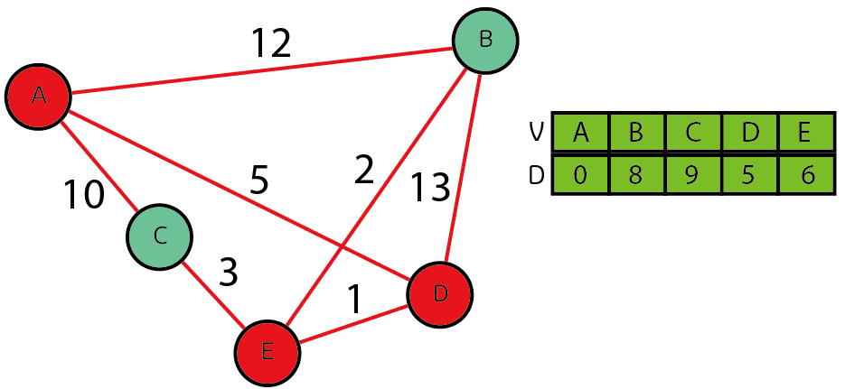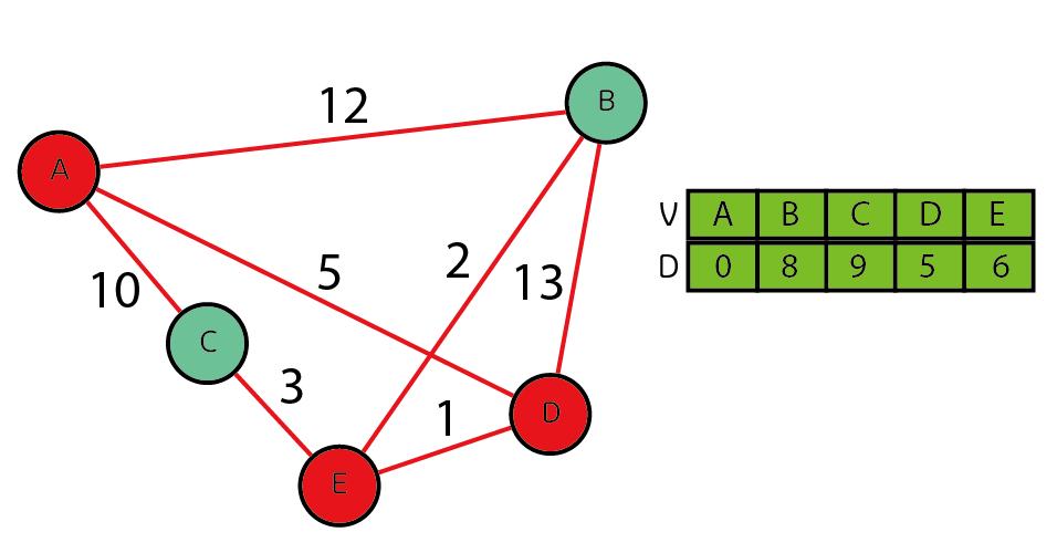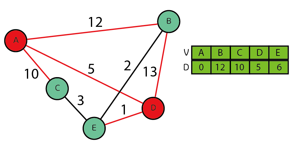 여기서 E의 가중치 값이 6으로 바뀌었는대 기존 A-D(5)에 D-E(1)을 더한 값인 6이 들어가게 된다.
