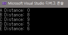std::cout << static_cast<char>('A'+i)<<" Distance: "<<distance[i]<< std::endl;
