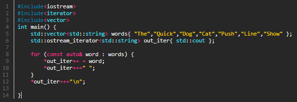 words 컨테이너를 출력 스트림 반복자를 이용해서 출력하는 예제이다.