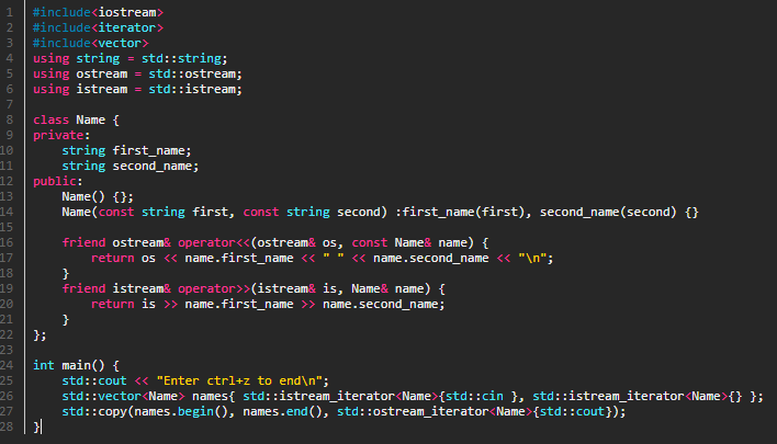 어떤 클래스 타입이라도 스트림 반복자를 사용하려면 삽입 연산자(<<)와 추출 연산자(>>)를 반드시 오버 로드해야 한다.