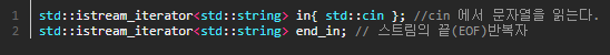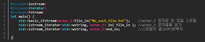 - 두 번째 문장은 파일을 읽기 위해 스트림 반복자를 정의한다. 스트림의 문자 타입은 istream_iterator의 두 번째 인자에 타입 인수를 지정하였으며 여기서는 wchar_t로 지정했다. 스트림에서 읽어올 객체의 타입을 지정하는 첫 번째 인수도 wstring이어야 하는데 이는 wstring이 wchar_t 문자들의 문자열 타입이기 때문이다.