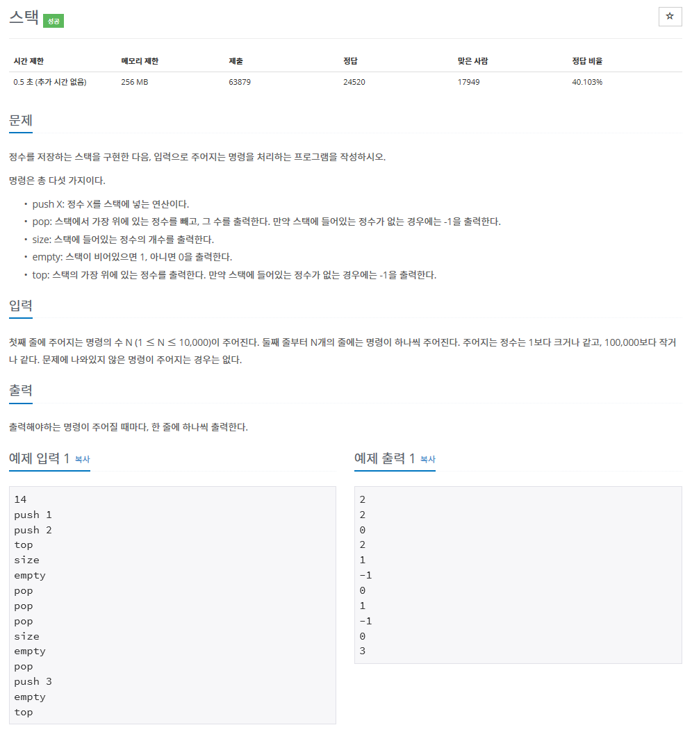 스택을 이용하는 간단한 문제를 풀어봤다. 지원하는 표준 Stack 라이브러리를 사용해도 무난하며 직접 구현을 해도 되는 문제이다. 라이브러리를 사용하면 쉽게 풀 수 있지만 이 문제의 의의에서 벗어난다고 생각해서 직접 구현해서 풀었다.